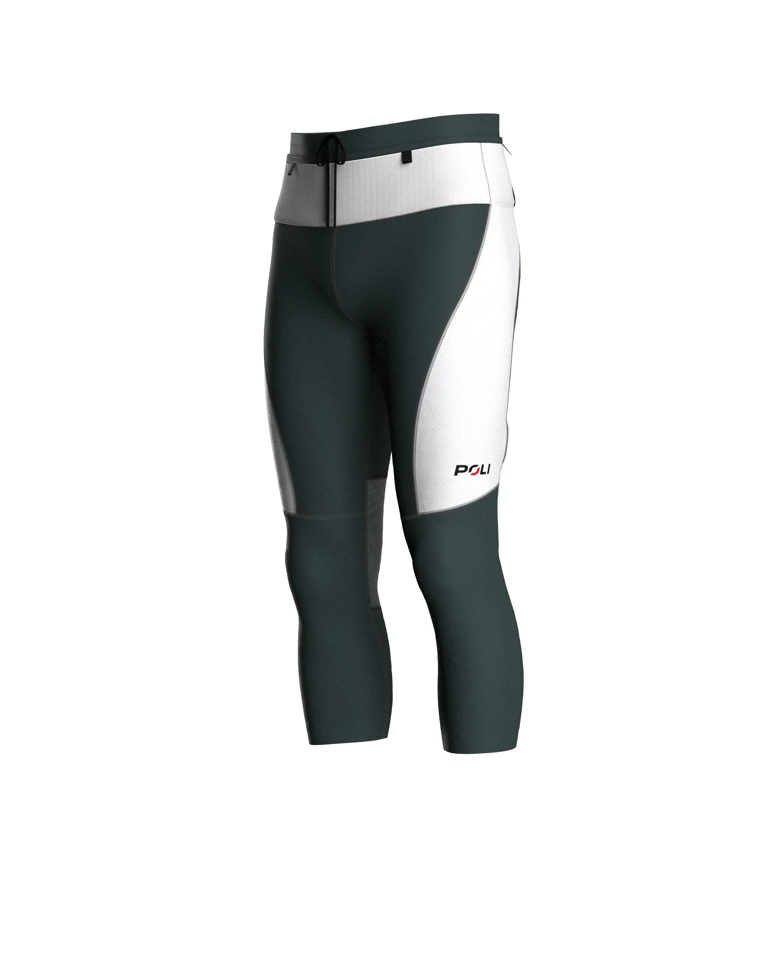 The unisex 3/4 tights PEAK, from the Performance range, are ideal for mid-season trail running. Made of 175 g/m² recycled polyamide/elastane, they combine durability, stretch, and breathability for optimal comfort. Their fitted cut features an ergonomic ventilated panel behind the knee and clean-finished hems at the calves. The customizable waistband includes 3 front mesh pockets with pull tabs, an invisible zipped back pocket, and optional pole holder elastics at the rear. Elasticated waist with external drawstring and reflective transfers at the back.